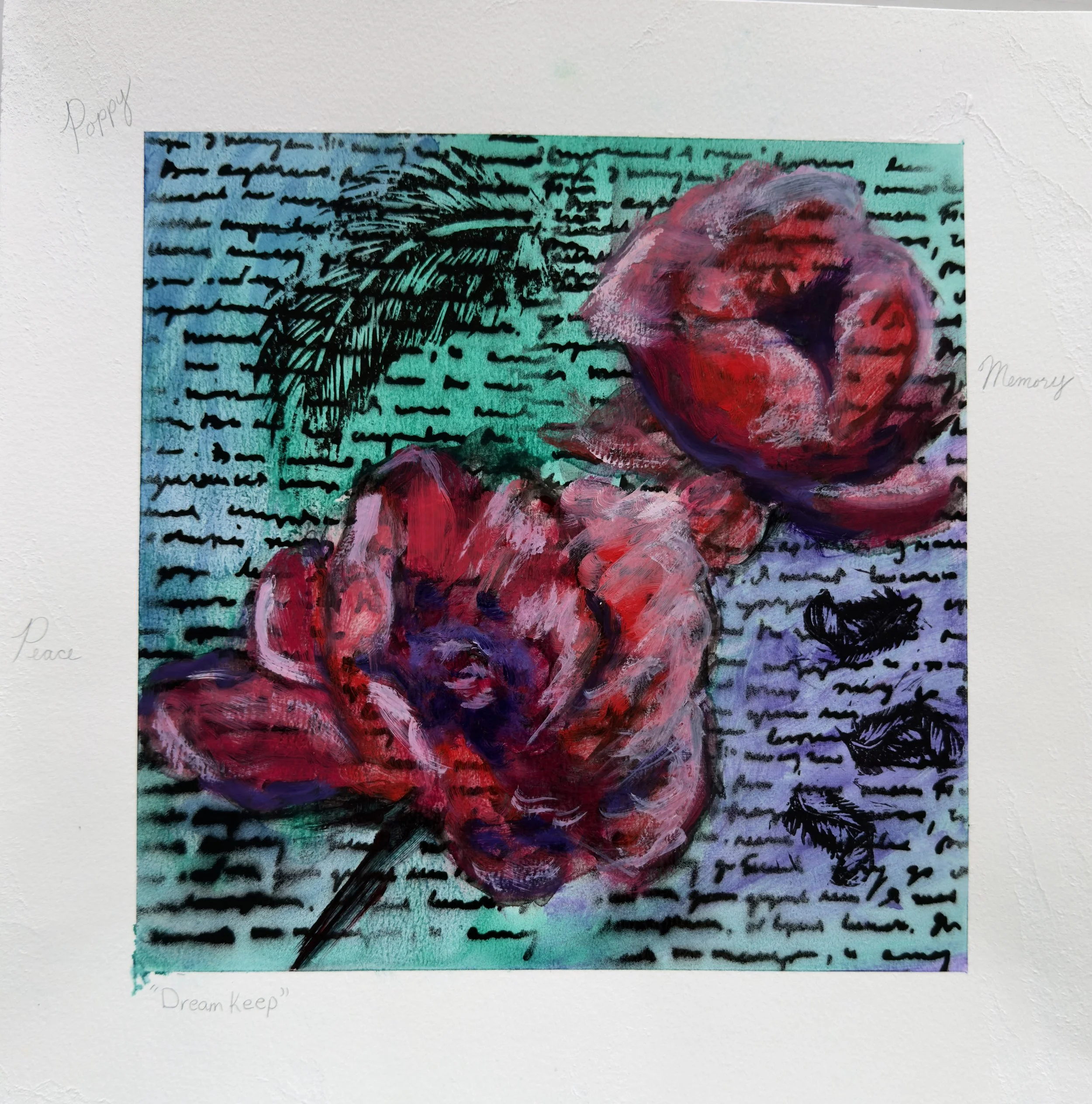 “Dream Keep” holds the gentle tension between remembrance and release. The poppies, symbols of memory and rest, gather their color around darkened script and feather markings echoes of what we carry forward. The palette of deep reds and teal blues evokes both tenderness and reflection, offering a sanctuary for the dreams we protect, the ones not yet ready to be spoken..