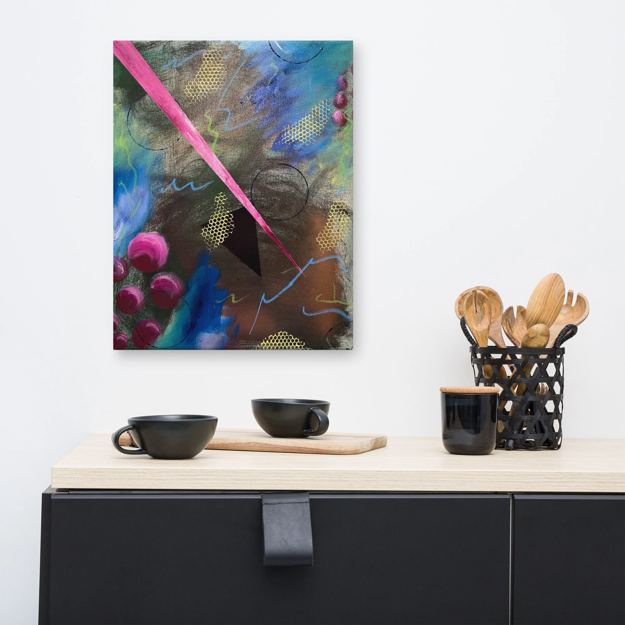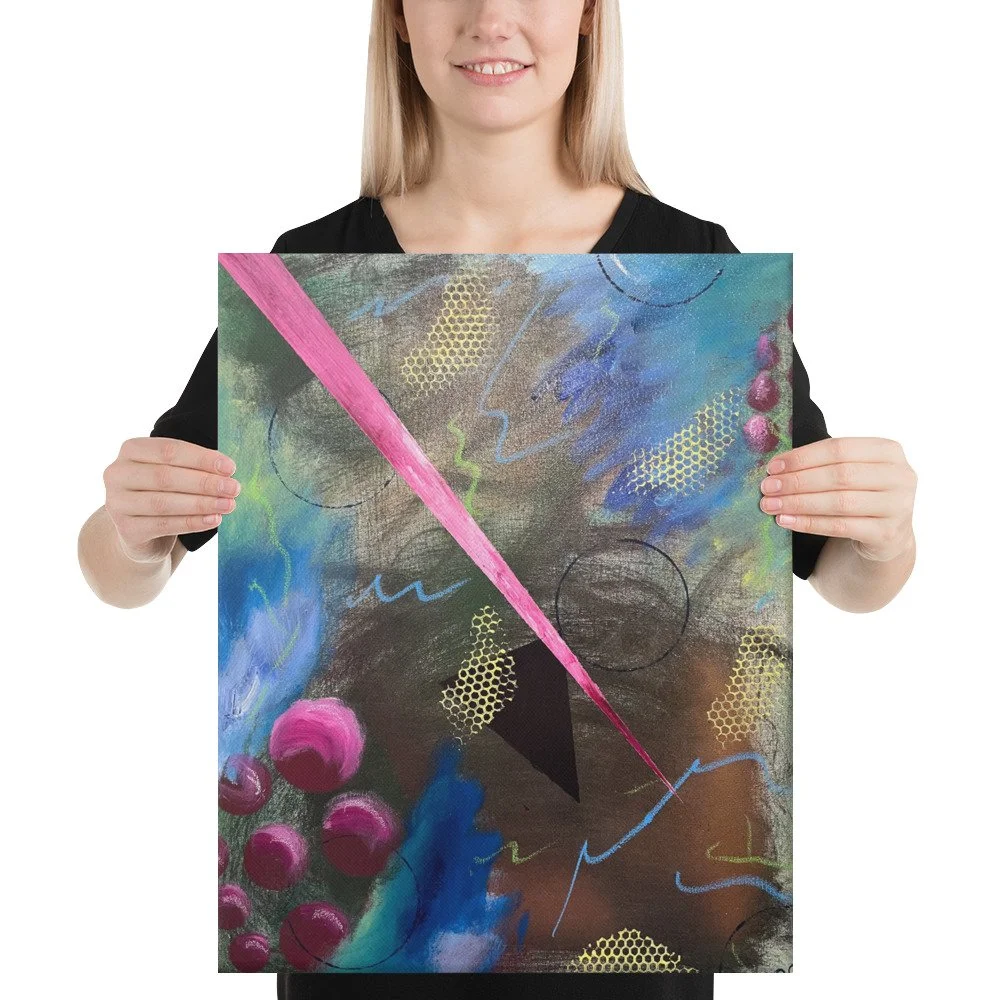 A vibrant collision of motion and stillness, Line Between Breath captures the moment where energy shifts and clarity cuts through the chaos. Bold marks, electric color, and organic textures create a dynamic visual rhythm a reminder of the thin, powerful line between inhale and exhale, presence and possibility.