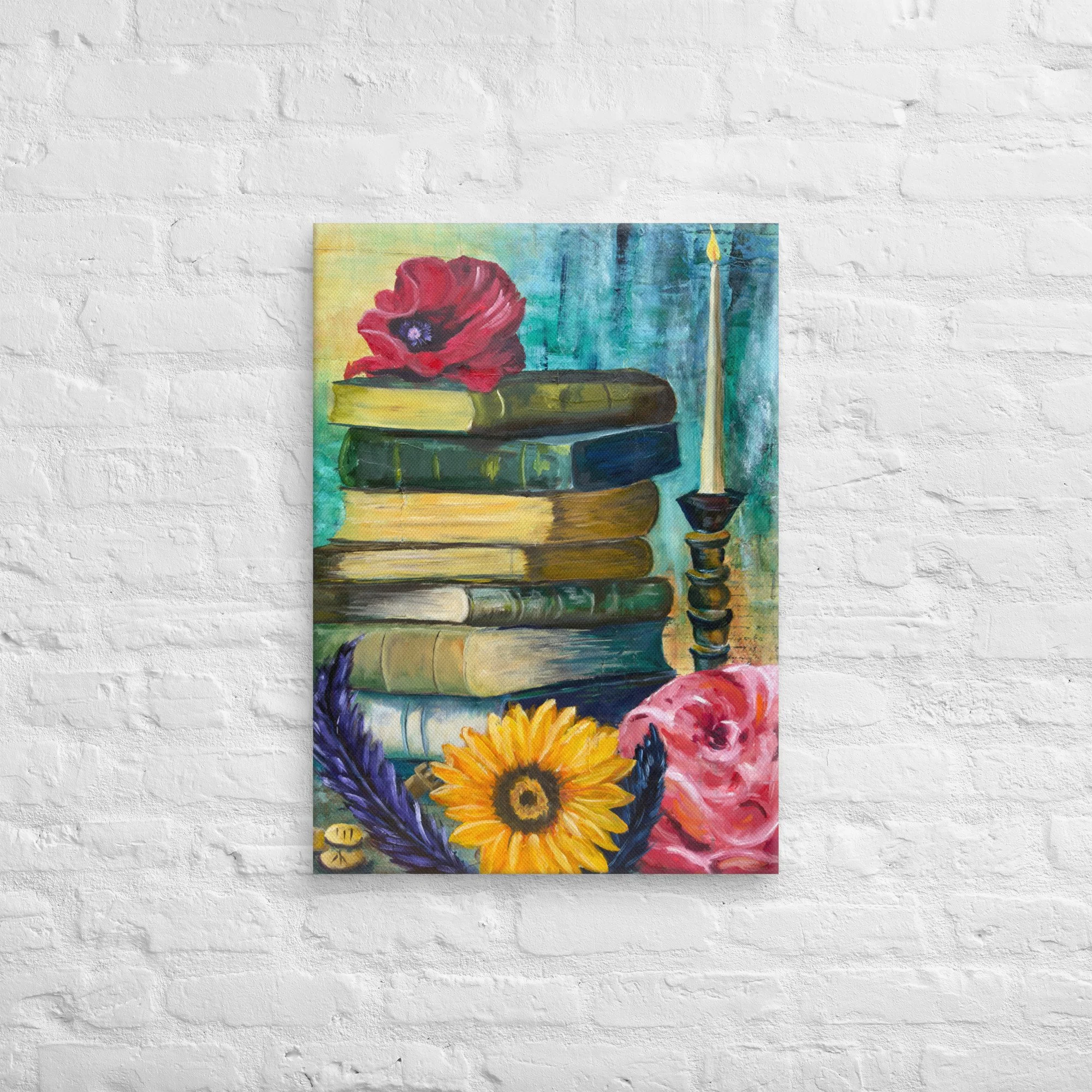 Layered pages, pressed flowers, and a single feather evoke the origins of myth and memory. This piece invites the viewer into a tale where words take flight and nature carries the narrative.