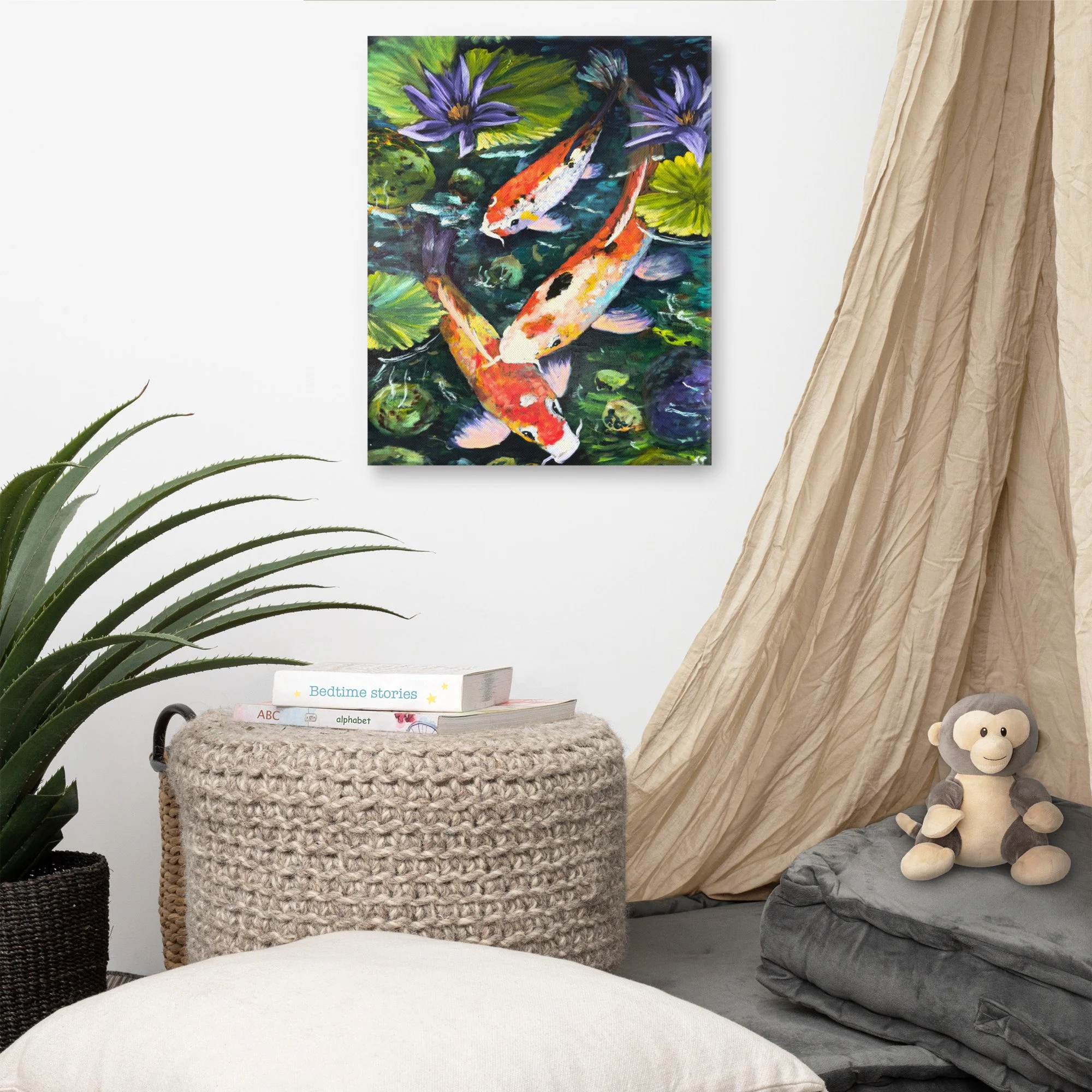 Flow of Fortune celebrates movement, abundance, and the quiet magic of nature’s rhythm. Vibrant koi glide through shimmering water, their colors dancing across lily pads and blossoms in a scene filled with harmony and life. This piece brings a sense of prosperity, peace, and graceful energy to any space.