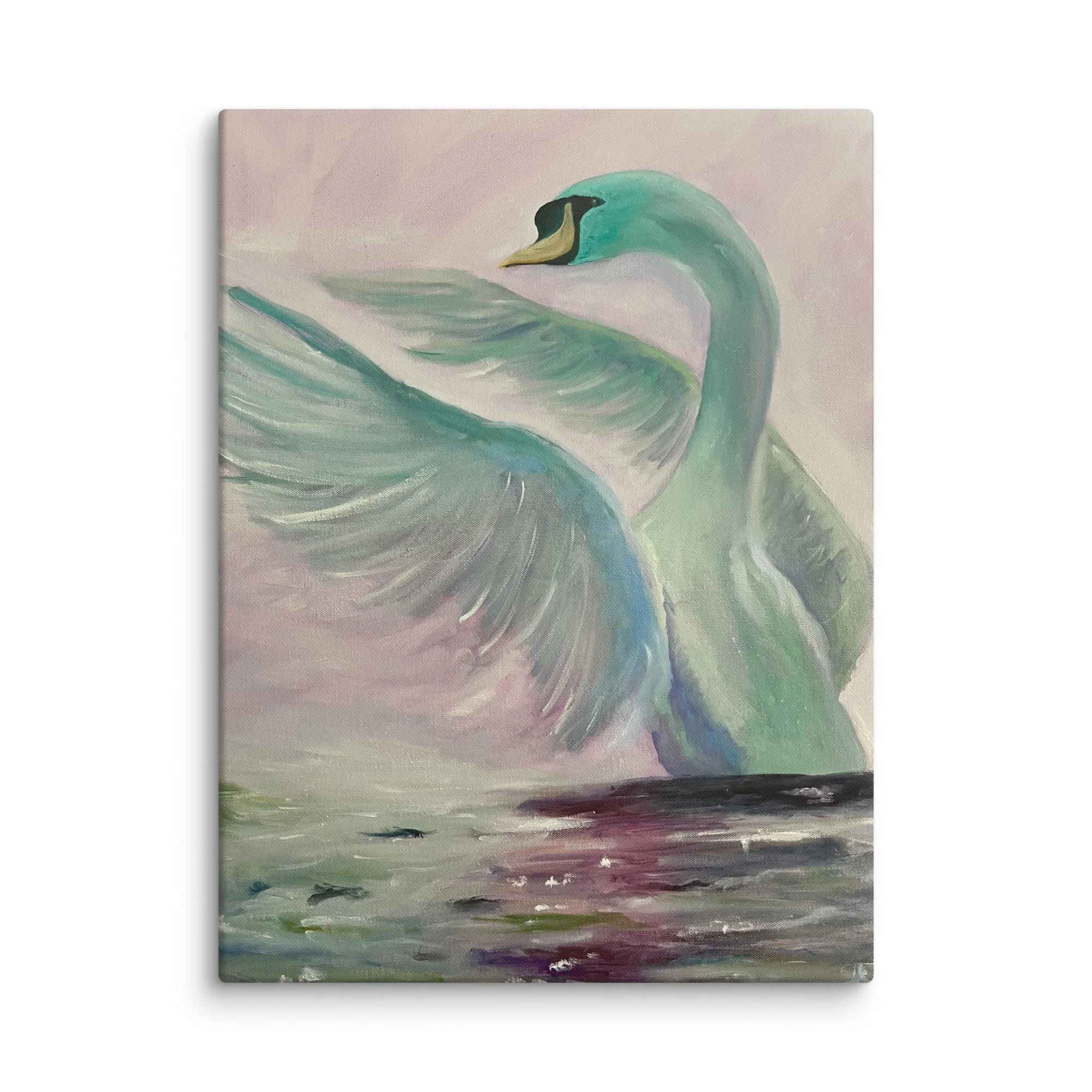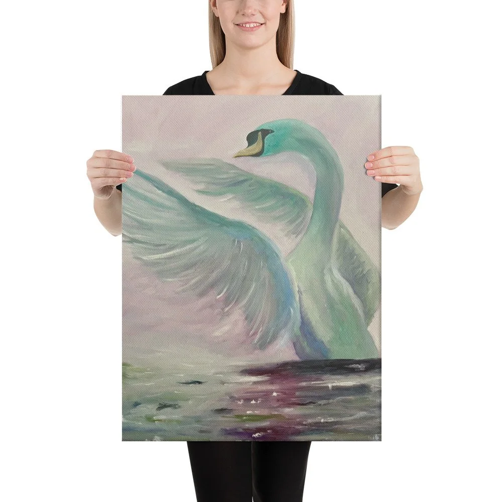 Soft pastels and luminous wings capture the quiet power of a swan rising into new light. Grace Born celebrates strength wrapped in gentleness a moment where movement, calm, and renewal meet on shimmering water.