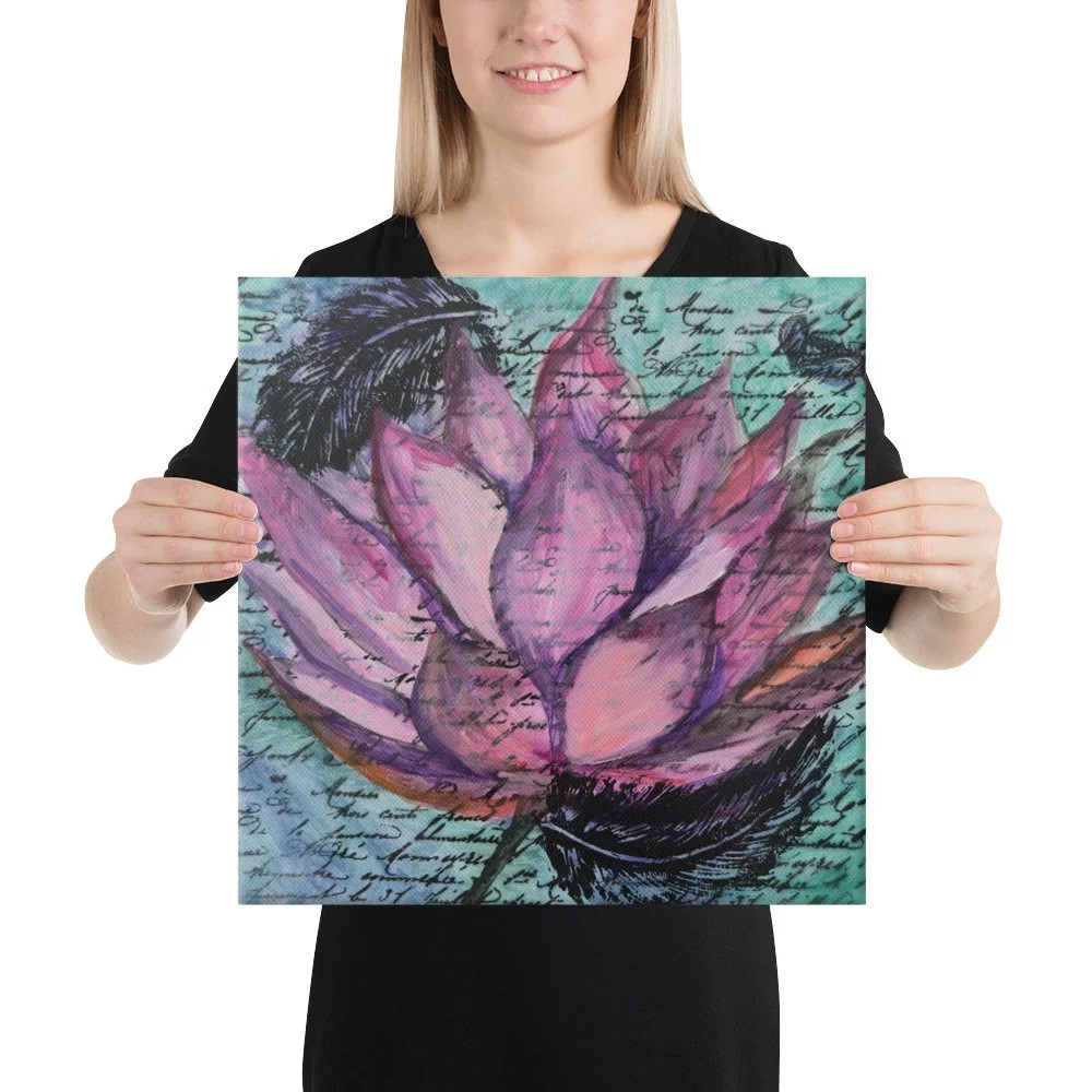 The lotus, revered across cultures as a symbol of triumph, purity, and renewal, emerges from deep blues and soft greens in “Rise Again.” Its petals lift upward through layers of handwritten memory and feathered symbolism echoes of hardship transformed into grace. This companion piece carries the energy of rebirth, reminding us that rising is not a single act but a lifelong devotion to hope.