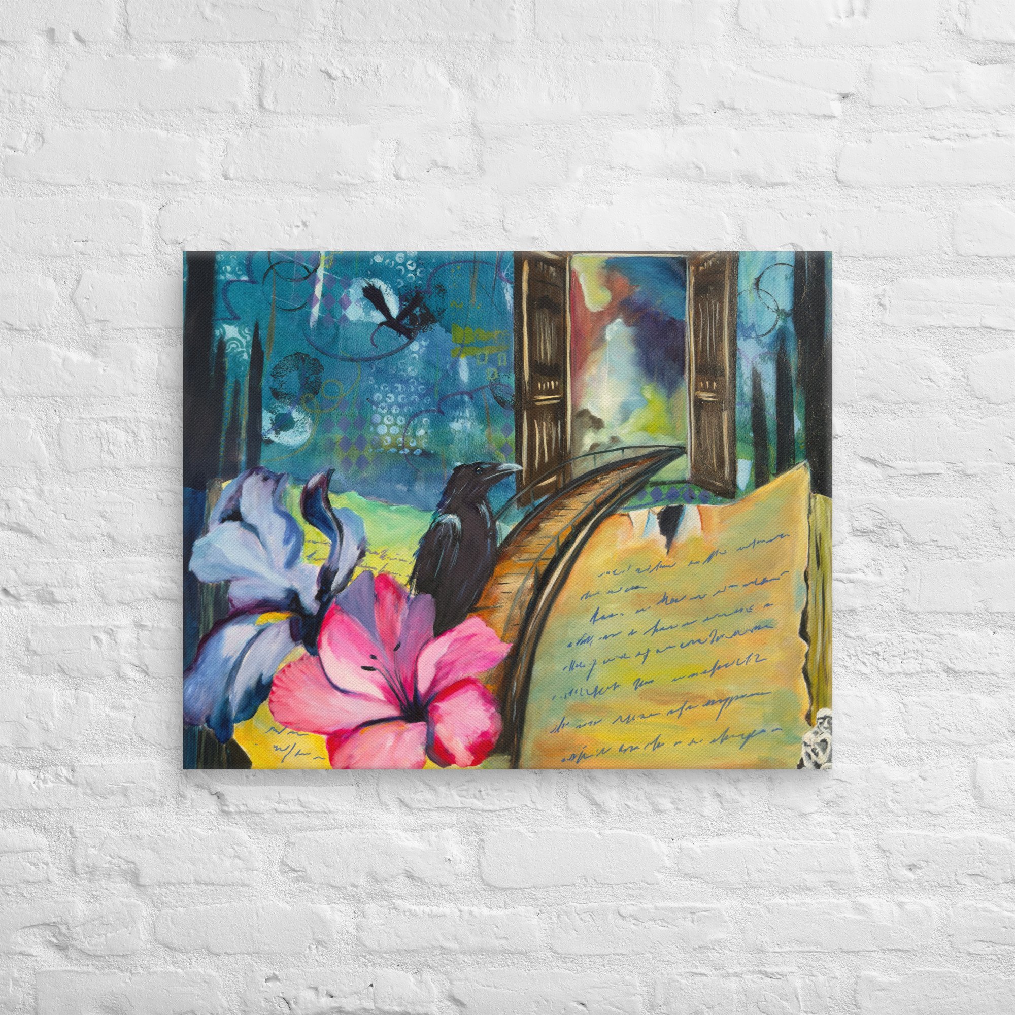 Gallery Boutique › The Bridge Between Worlds Image 1 of 2 Image 2 of 2 The Bridge Between Worlds $65.00 A wooden bridge leads from torn pages into a glowing new realm. This piece marks the moment of crossing from the familiar into the transformative. 30" x 24" • 1.25″ (3.18 cm) thick poly-cotton blend canvas • Canvas fabric weight: 10.15 +/- 0.74 oz./yd.² (344 g/m² +/- 25g/m²) • Fade-resistant • Hand-stretched over solid wood stretcher bars • Mounting brackets included • Blank product sourced from the US, Canada, Europe, UK, or Australia Quantity: Purchase Added! A wooden bridge leads from torn pages into a glowing new realm. This piece marks the moment of crossing from the familiar into the transformative. 30" x 24" • 1.25″ (3.18 cm) thick poly-cotton blend canvas • Canvas fabric weight: 10.15 +/- 0.74 oz./yd.² (344 g/m² +/- 25g/m²) • Fade-resistant • Hand-stretched over solid wood stretcher bars • Mounting brackets included • Blank product sourced from the US, Canada, Europe, UK, or Australia
