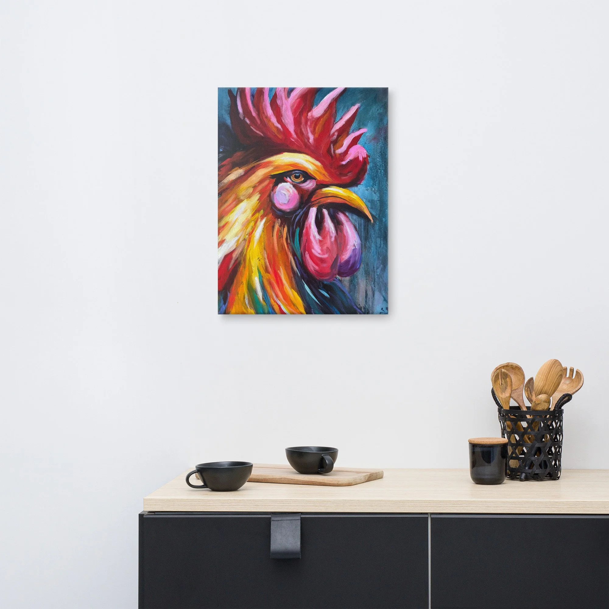 This vibrant rooster radiates pure confidence, its fiery feathers and piercing gaze capturing the moment morning refuses to be ignored. A lively celebration of color and courage, this piece brings unstoppable energy into any space.