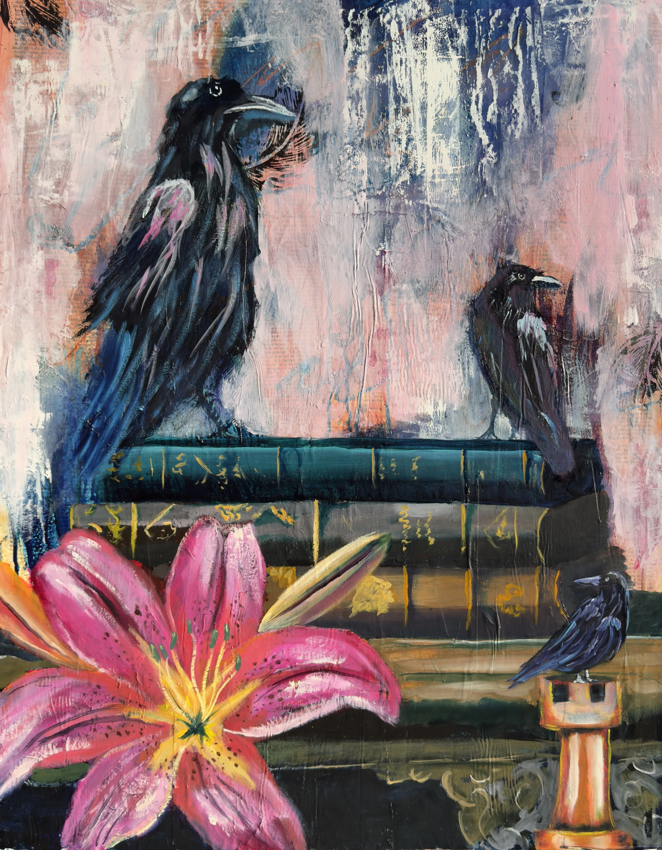 Ravens perch on stacked books and a rook chess piece while a stargazer lily unfurls in the foreground. Scripted backgrounds and soft patina colors suggest a story completed and treasured. This closing work affirms that while a chapter ends, the wisdom and hope it offered will never be lost.