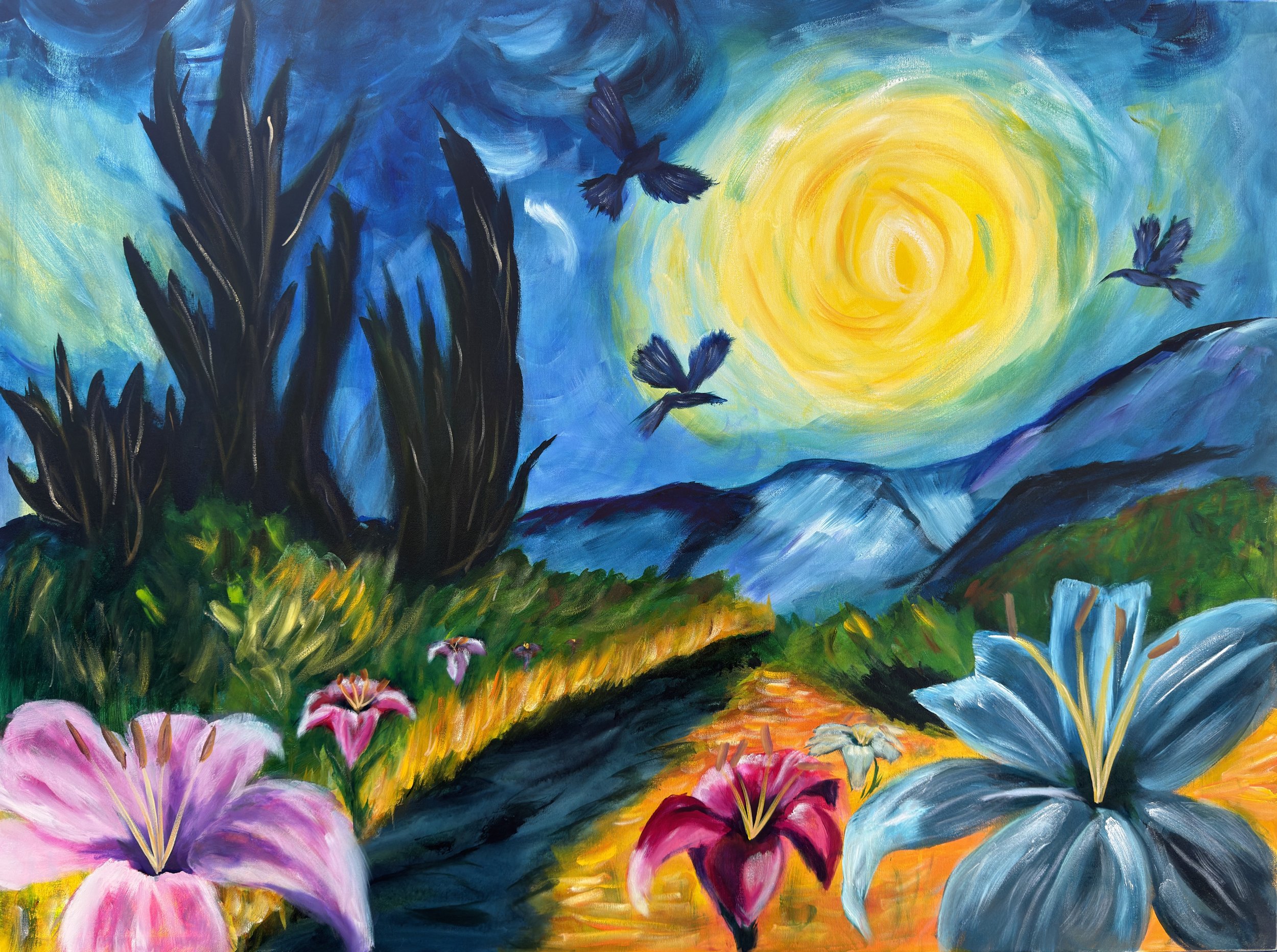 A blazing sun anchors a sky of swirling blues while ravens sail above brilliant lilies and rolling hills. The entire canvas seems to rise toward joy. Here, the series reaches its triumphant crest: light is no longer fragile but confidently filling the world.