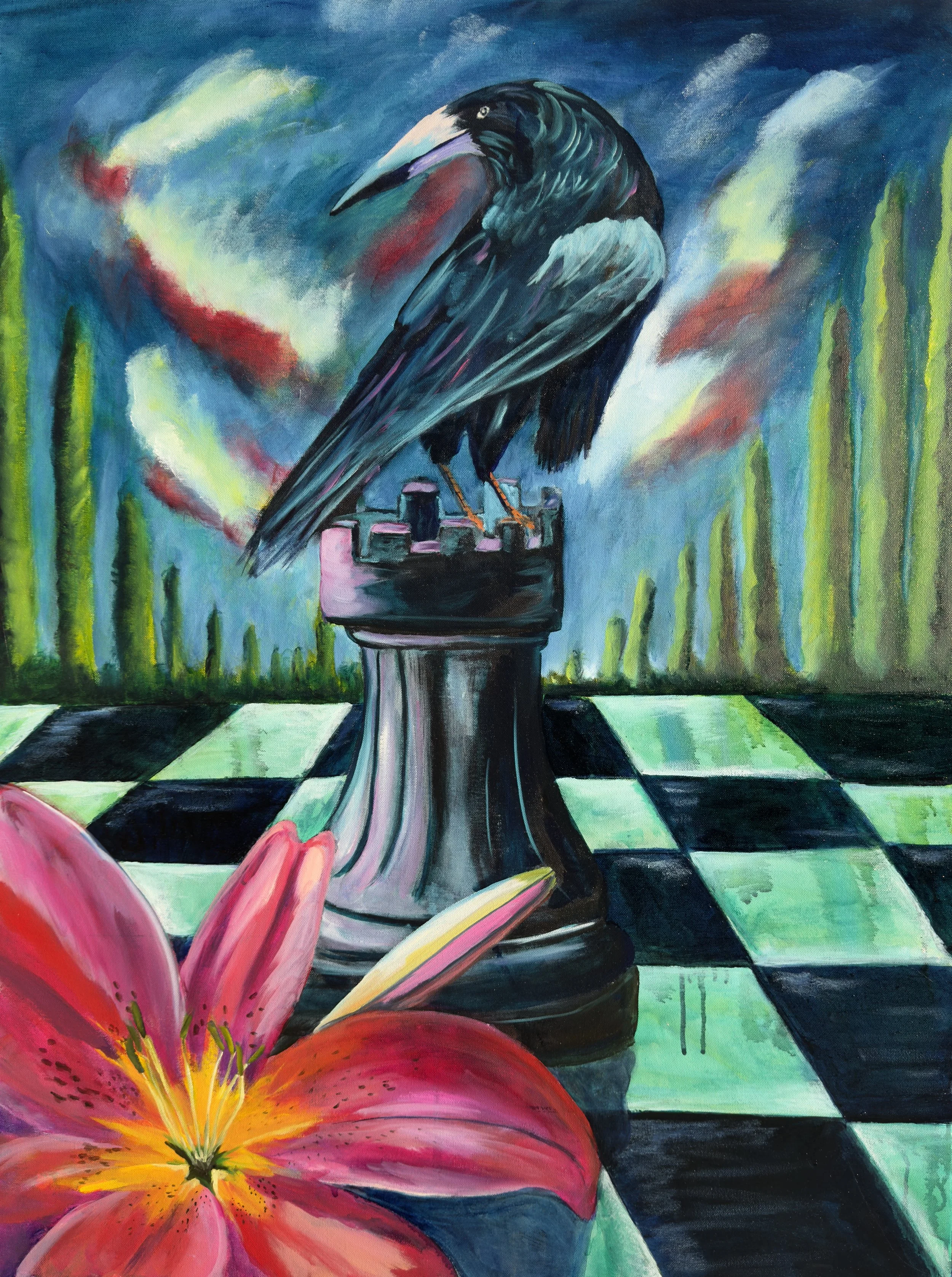 A proud rook stands atop a rook chess piece on a glowing checkerboard, lilies burning in the foreground. Tower and bird together embody steadfast protection and strategic grace. The painting is a visual vow: some parts of us will not be moved by fear.