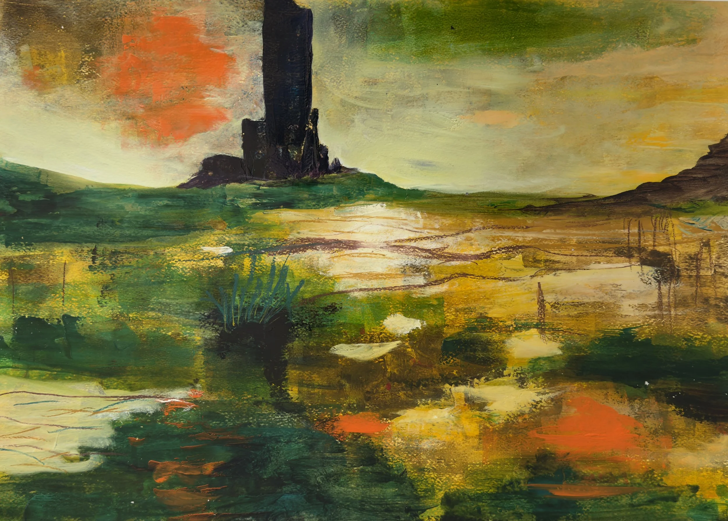 Gold, teal, and and soft ember-pink explore the meeting place of land and light. A landscape felt through color rather than geography.